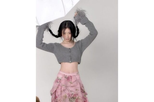 チェリョンがSNSに近況写真を投稿し、グレーのクロップカーディガンとピンクのスカートで魅力を披露した。