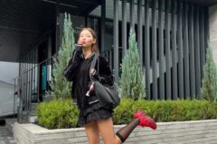 ソン・ヘナ、ブラック×レッドで魅せる都会的ストリートルック ソン・ヘナが都会的なストリートスタイルを披露し、ブラックとレッドのコーディネートで個性を表現。